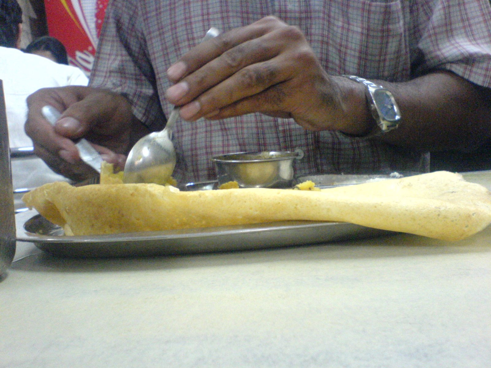 The take is simple don’t fork my dosa. And this isn’t a naan-issue.This incidentally is at the Madras Cafe at Green Park where, along with Adyar Ananda Bhavan (A2B, yeah), one can get dosas for Rs 50/- and about 50 ml of Pongal for Rs 40. I’m thinking, “Keep it.”