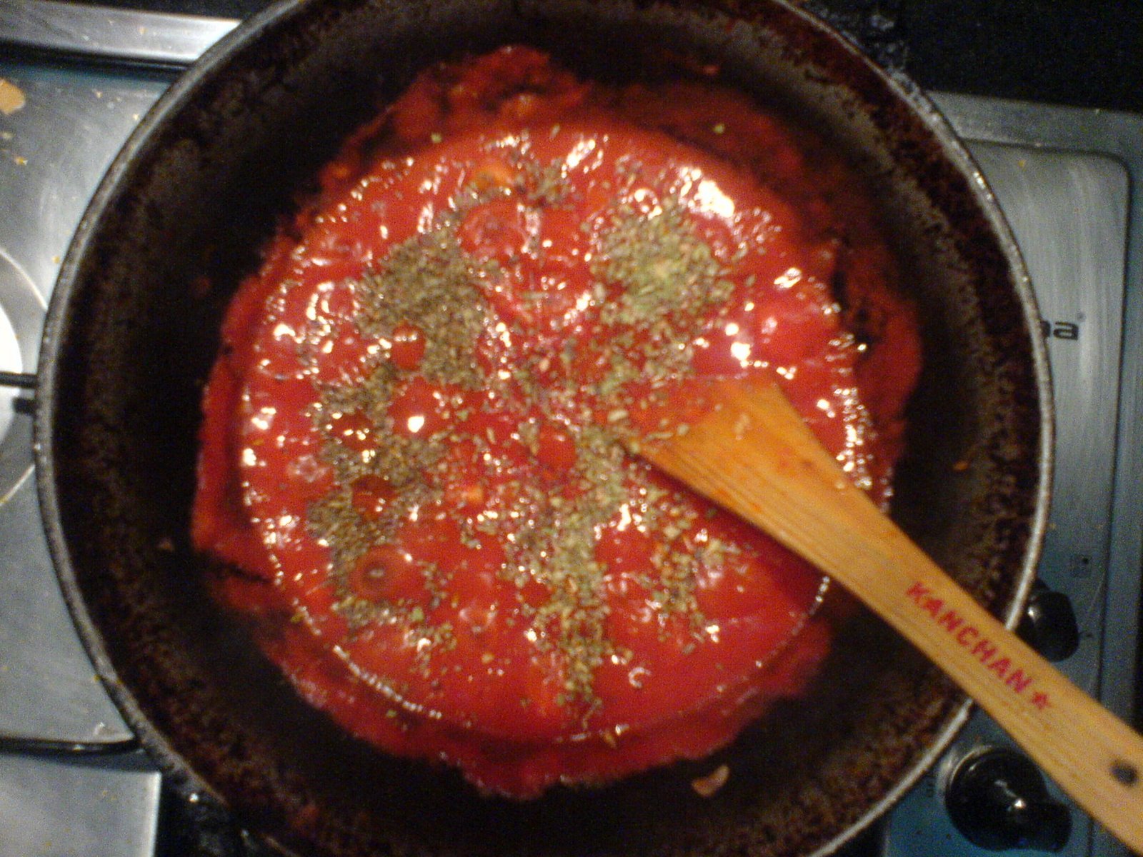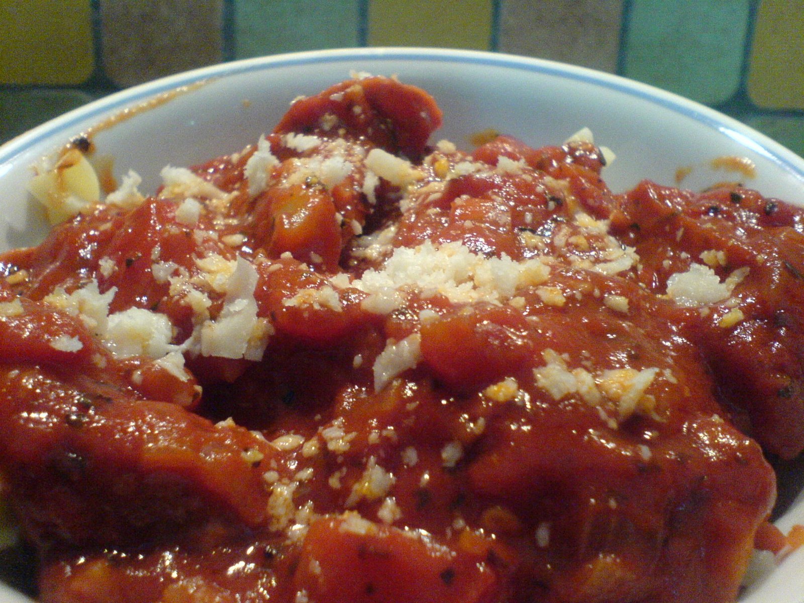 Straight forward stuff really. Blanch tomatoes, peel and cut roughly. Saute some finely sliced onions in olive oil, toss a crushed clove or two of garlic. Once they’re soft, in go the tomatoes and some tomato puree. Add salt and paprika and oregano/basil/mixed herbs. Let it all simmer away merrily till it looks, tastes and smells cooked. Feel free to throw in some pepperoni slices/cut up sausage along the way. Al dante some pasta in the mean time and drain out the water. Mix it all up. Top with grated parmesan.