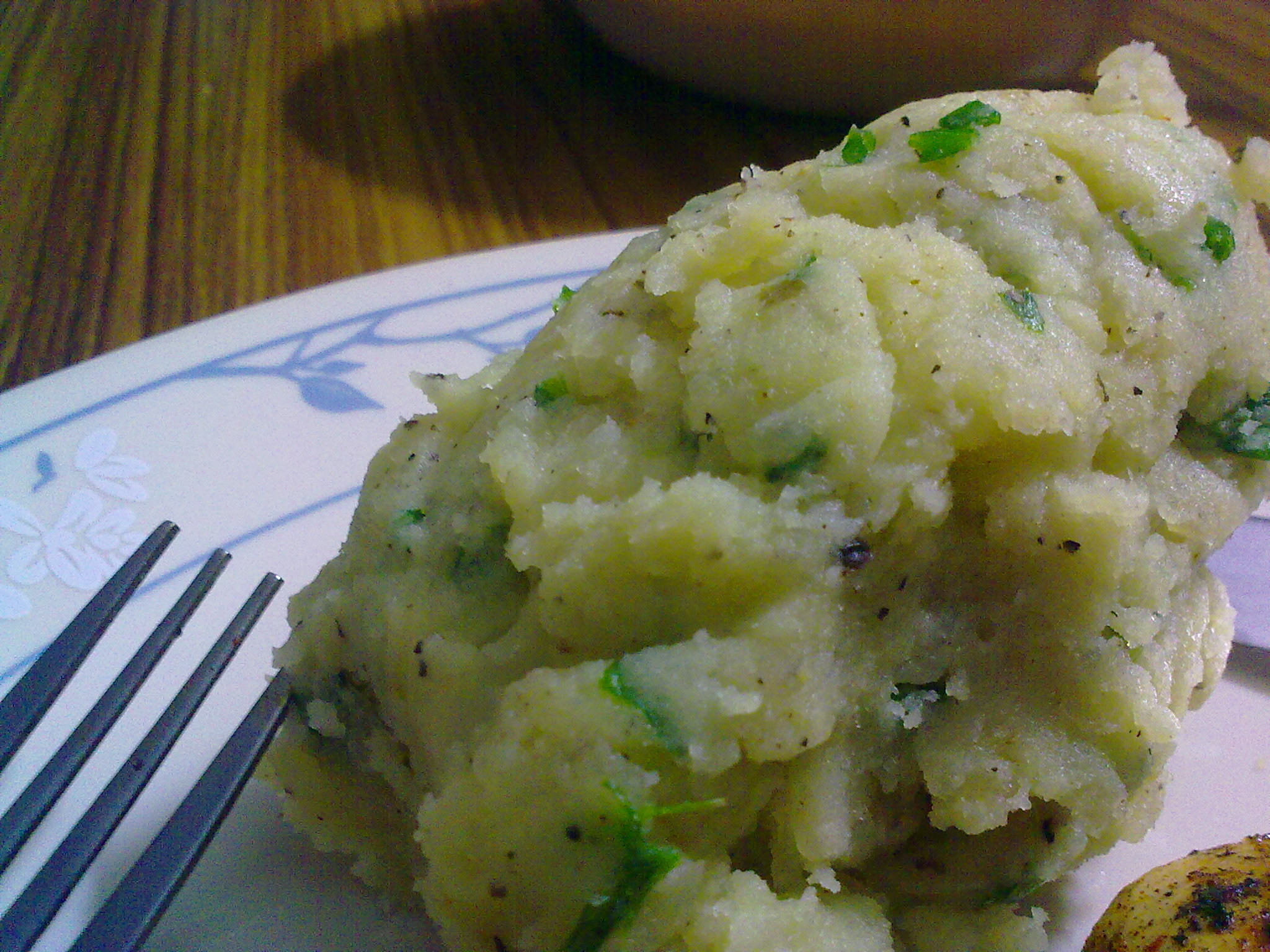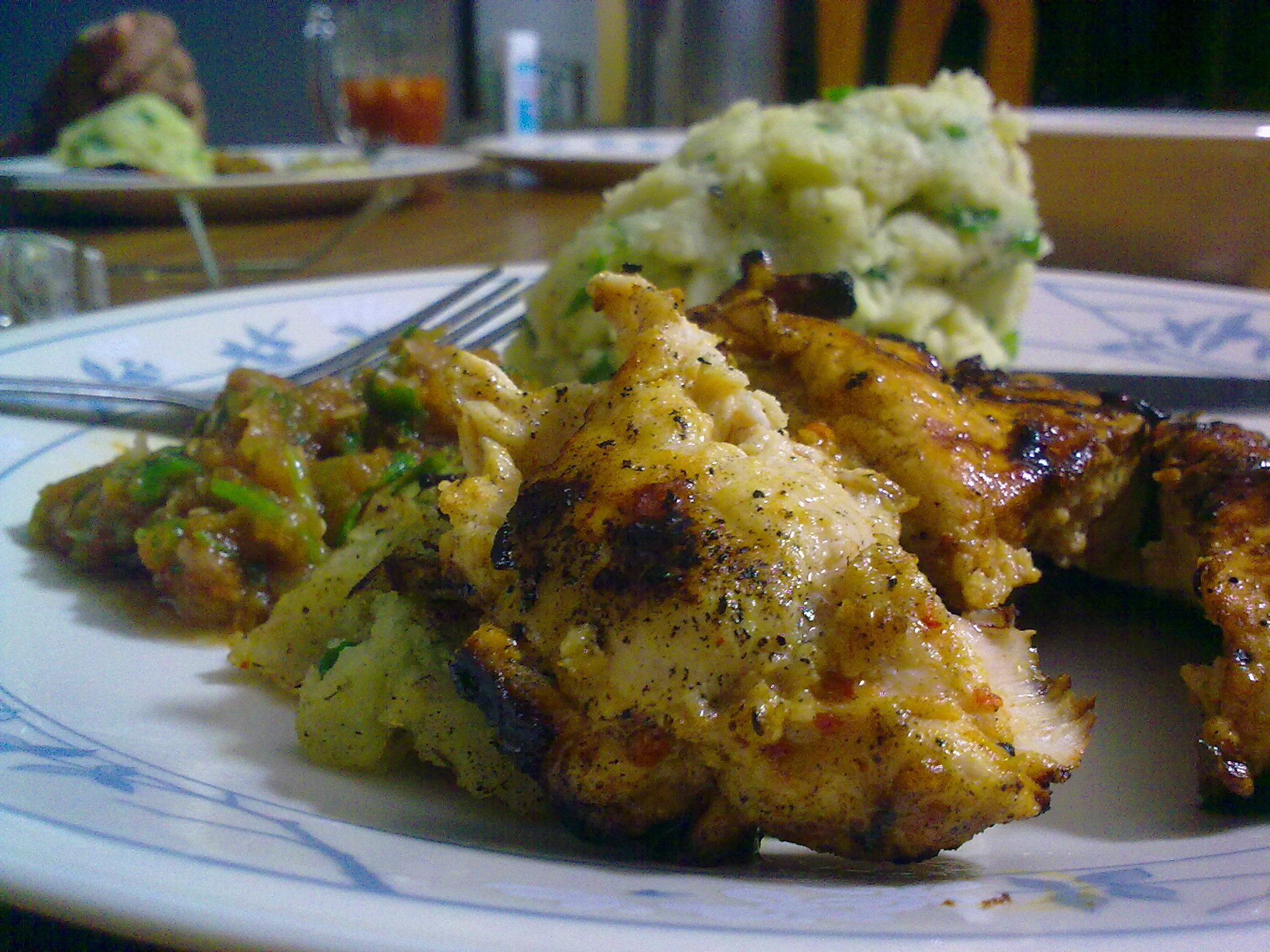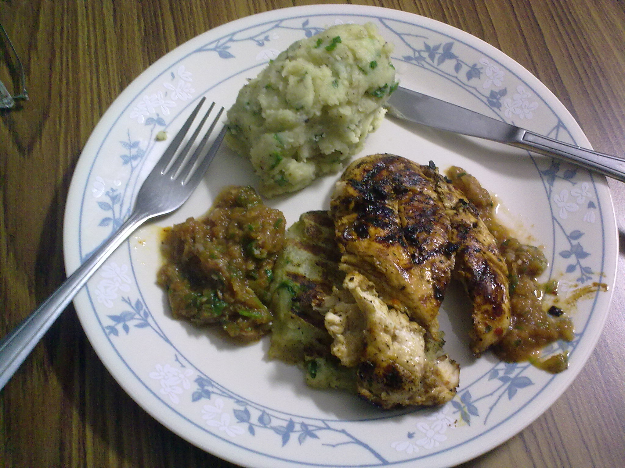 That’s chicken marinated in olive oil, lemon, paprika, mace and allspice with a tomato salsa and mashed potatoes.
